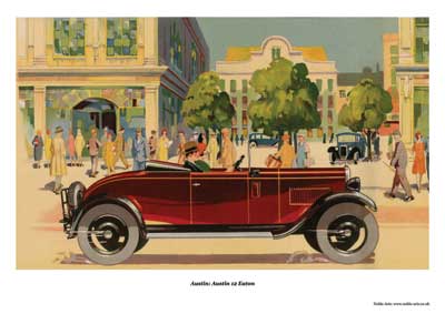 Taken from an original banner for an Austin saleroom painted and designed by my Grandfather. The model shown is, I believe, an Austin 12 Eaton open top. The picture shows off this fine motorcar of the 1930's and has a lovely art deco feel.
