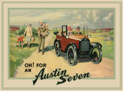 A stunning print from an original poster advertising the Austin 7 chummy. Note the humorous registration plate RU412. The poster demonstrates the benefits to the family of the time of car ownership. I believe that the family walking are dreaming of having an Austin 7 and they are pictured in the car.