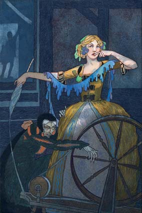 A watercolour by Margaret Noble circa 1920 showing the princess in the process of being put under a spell by the evil fairy after being pricked by a spindle. Her father arrives in the doorway seconds too late to save her.