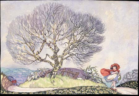 From Little Red Riding Hood. The little girl leaves the safety of her cottage to go to nurse her grandmother. The sweet girl looks back wistfully to her cottage in the distance.