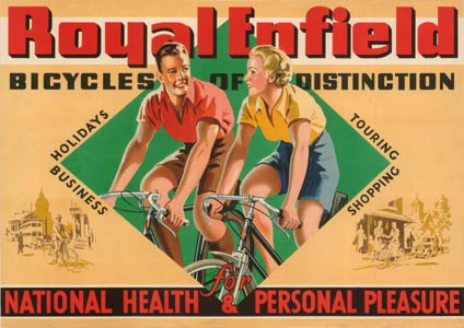 A print from a poster by Douglas Maxfield advertising Royal Enfield Bicycles. It urges us to have a bike that makes us stick out from the crowd and would grace any cycle lover's wall.