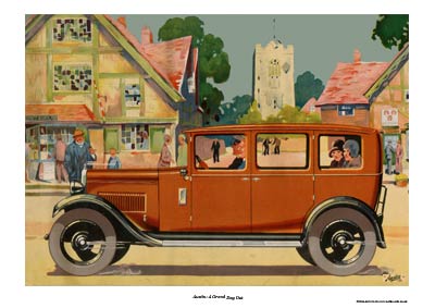 Taken from an original banner for an Austin saleroom painted and designed by my Grandfather. The model shown is, I believe, an Austin 16, 4 cylinder. It is much arger than the little 7 and even had space for a chauffeur as we can see. The picture shows off this fine motorcar of the 1930's and has a lovely art deco feel.