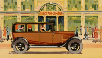 This print is taken from the Austin salesroom banner circa 1930 by my Grandfather. It shows how a salesroom would have looked and is a wonderful snapshot of history. It features a beautiful Austin motorcar of the era.
