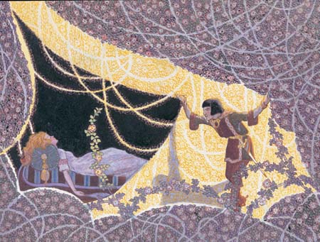 From Sleeping Beauty the Briar Rose. The prince opens the curtains of the princess's bed and looks upon her beauty before he steals a kiss. A romantic print with vibrant colours from an original by Margaret Noble circa 1920.