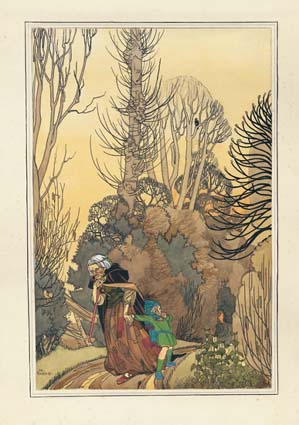 A haunting illustration by Margaret Noble taken from Hansel and Gretel. The Witch has the child by the hand and is leading him further into the forest and away from safety. I particularly like the plants in this picture and the Witch is very scary.